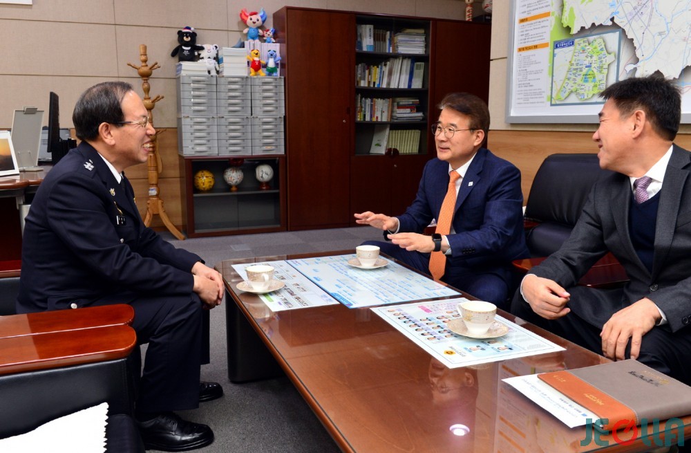 정종제 광주광역시 행정부시장은 9일 오후 시청 3층 행정부시장실에서 신임 김병로 서해지방해양경찰청장의 예방을 받고 환담을 나누고 있다./광주광역시 제공