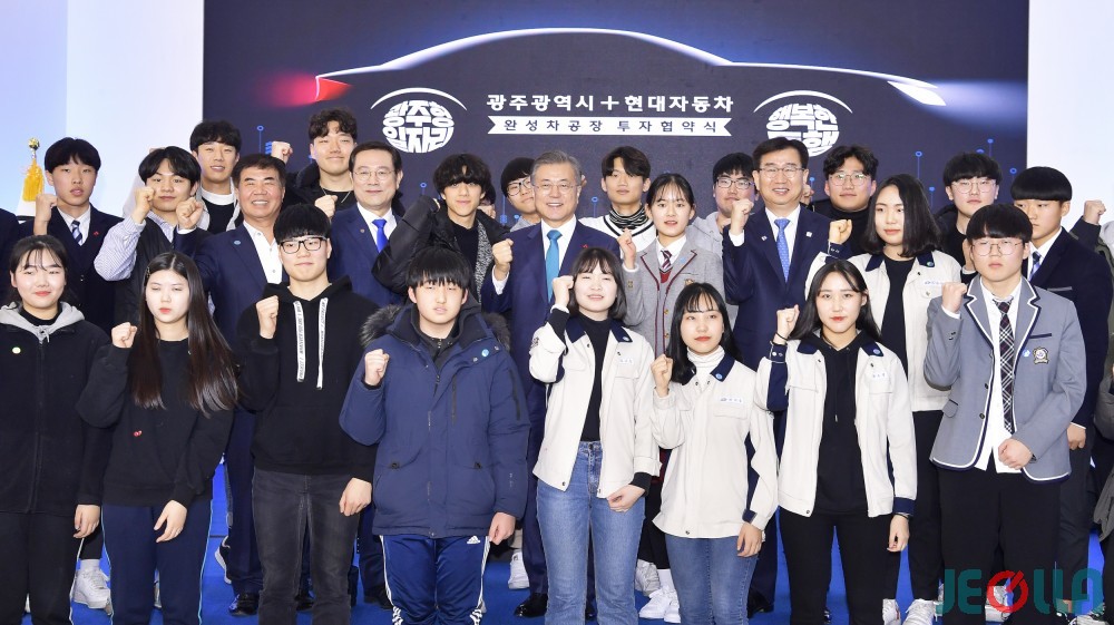 문재인 대통령과 이용섭 광주광역시장, 이원희 현대차 대표이사 등이 31일 오후 시청 1층 시민홀에서 열린 '광주광역시-현대자동차 투자협약식'에 참석해 행사를 마친 뒤 기념촬영을 하고 있다./광주광역시 제공