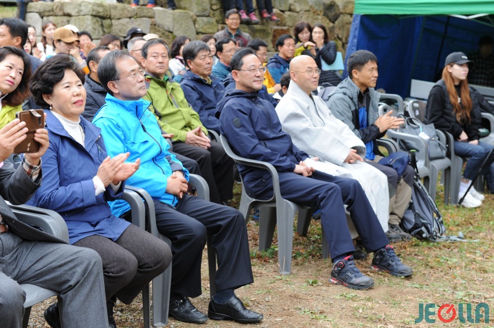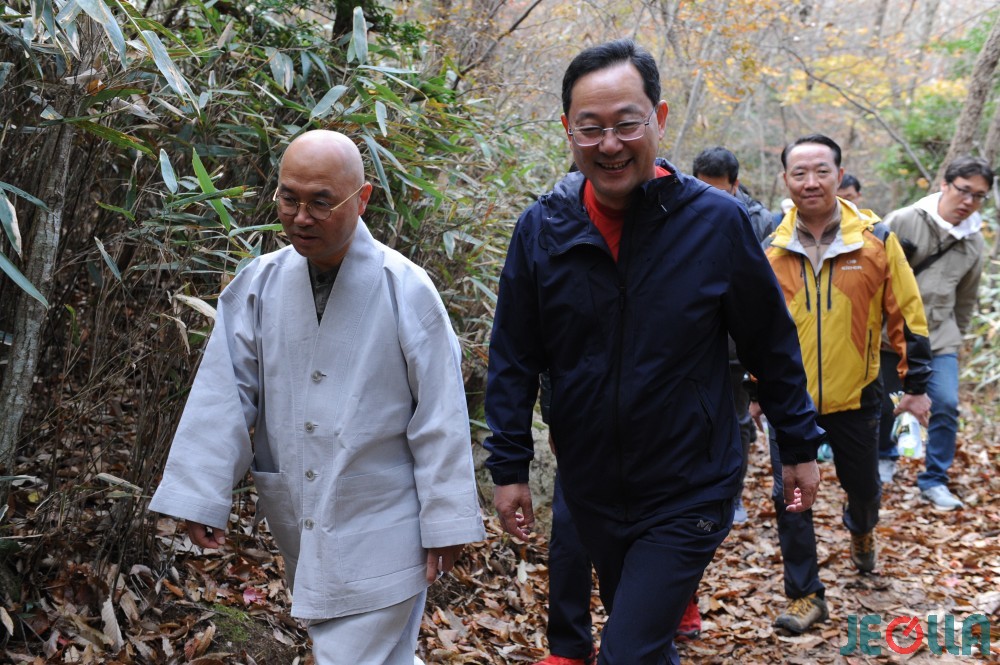 금강스님과 명현관 해남군수님이 달고고도 걷기를 시작합니다. 그런데 아슬아슬하게 건진 컷입니다. 카메라를 보고 해맑게 웃는 참가자 한 분이 두 분의 앞을 가려서...ㅎㅎ