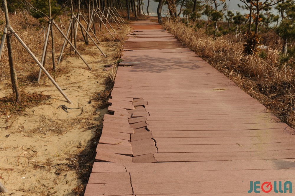 • 완도군이 블루플래그 재인증 추진하고 있는 명사십리해수욕장의 관리 실태가 엉망이다. 해수욕장 송림을 따라 관광객들이 걸어 다닐 수 있게 조성된 데크가 부서지거나 움푹 패여 관광객들의 안전을 위협하고 있다.