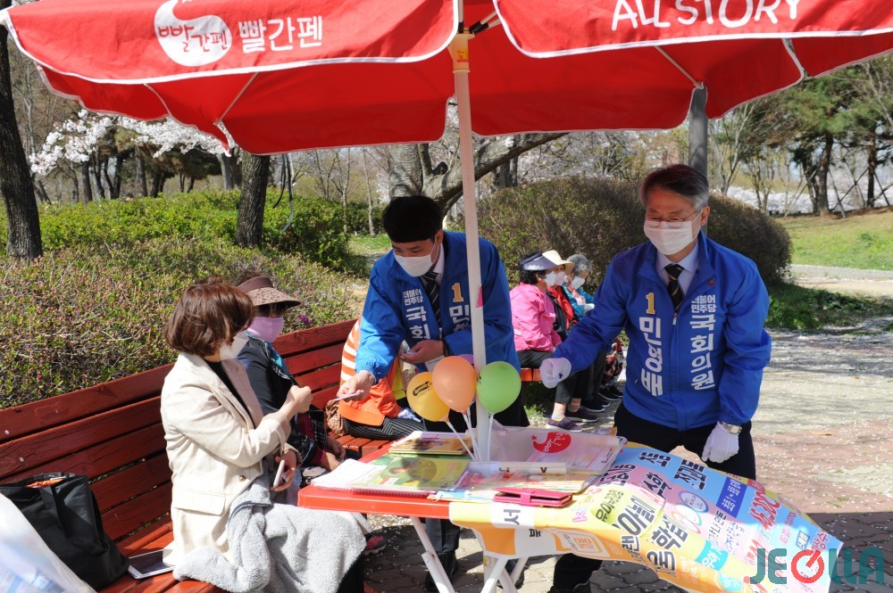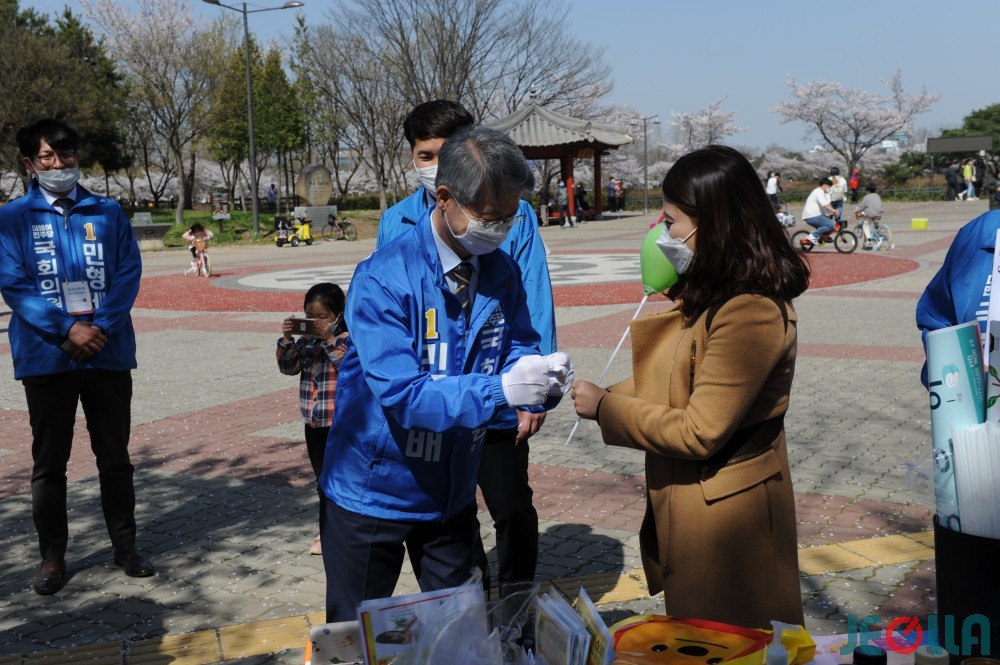 광주 광산을 민형배 더불어민주당 후보가 첨담쌍암공원에서 주말 나들이에 나선 시민을 상대로 도보 유세를 하고 있다.