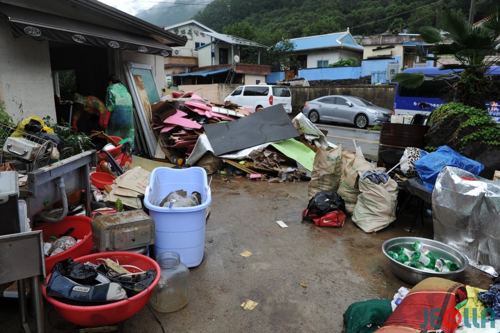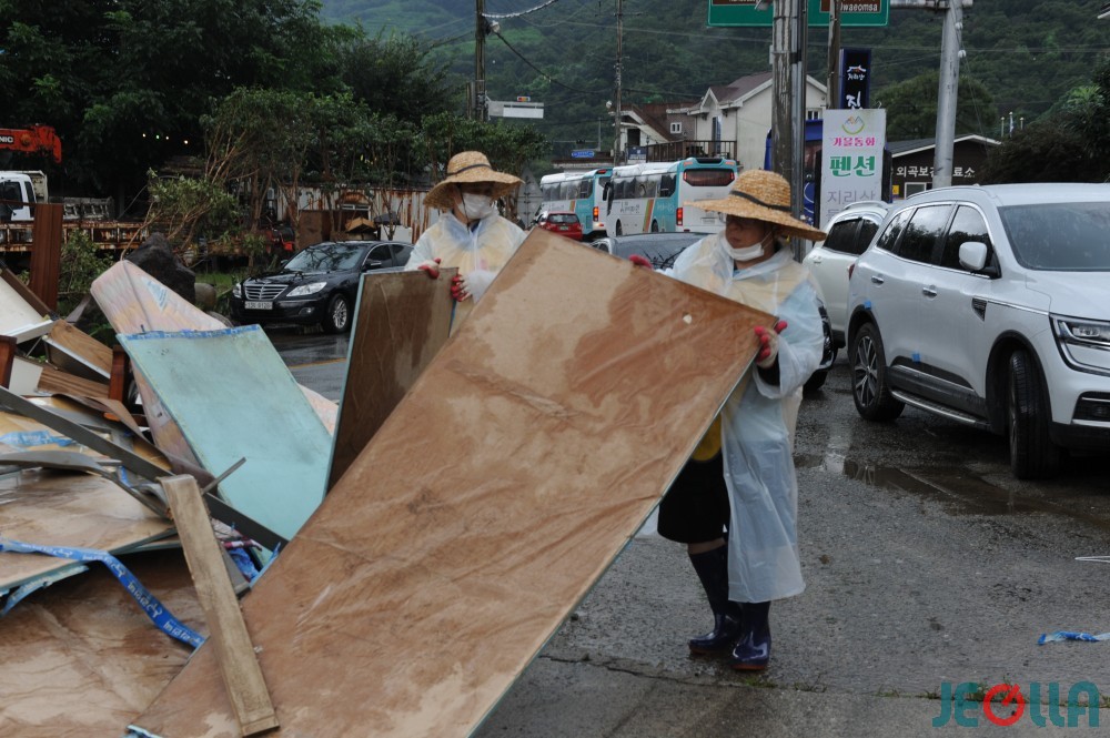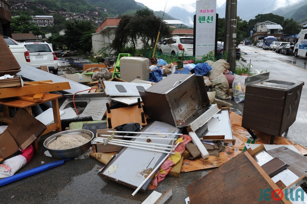 • 11일, 섬진강 범람으로 물벼락을 맞은 구례군 토지면 외곡리 수해 현장은 물 빠진 수중 마을의 모습이었다. 집 안에서 자원봉사자들의 손에 들려 나오는 가재도구나 가전제품 중 재사용이 가능한 제품은 거의 없어 보였다.