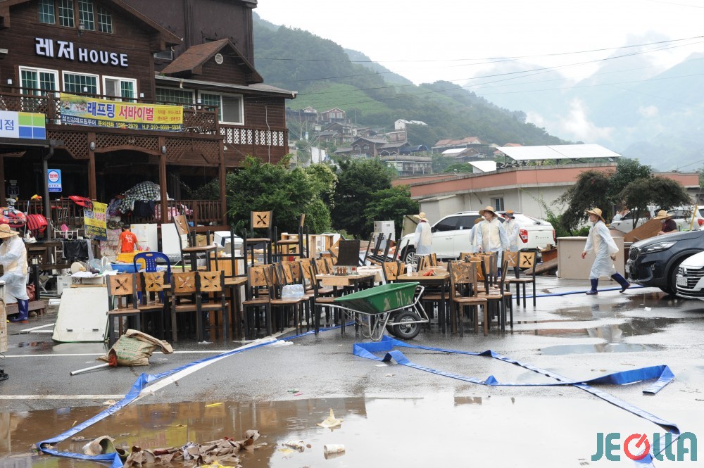 • 폭우가 쏟아지지는 중에도 복구 작업 중인 자원봉사자들